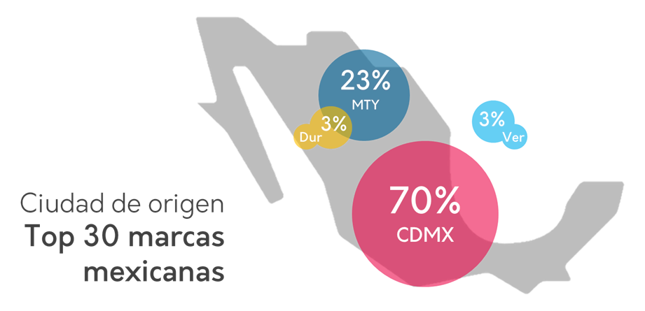 No es de sorprender que la mayor parte de estas marcas hayan nacido y se localicen en la Ciudad de México. Para ser precisos, 21 de estas 30 marcas son capitalinas, es decir, el 70%. Enseguida de la Ciudad de México se encuentra Monterrey, con 7 de estas 30 (el 23%). En menor medida se puede observar a las ciudades de Veracruz y Durango, con una marca cada una (Lala y Chedraui).