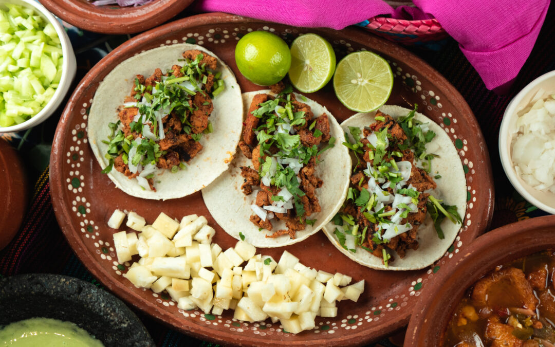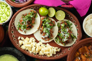 Top view of tasty tortillas with meat next to raw potato cubes and sliced lime